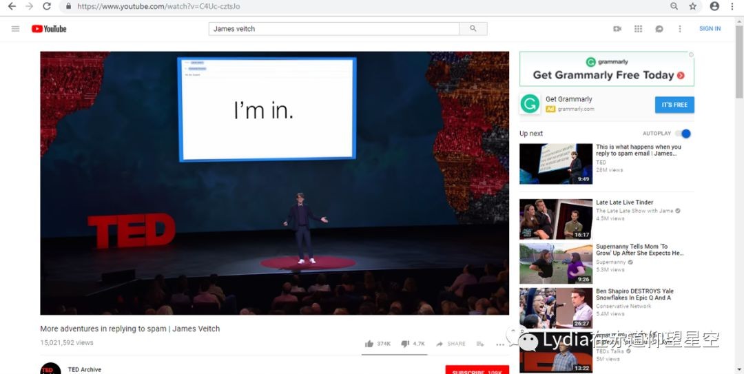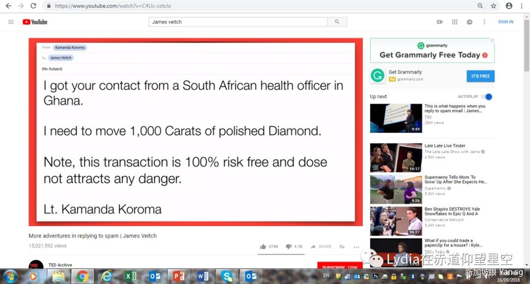 另外还有一个让我笑到不行的段子是James Veitch的 More Adventures in replying to spam. 你也可以在Youtube上搜到。这是他在TED talk上讲的,屏幕上打出了他和骗子的来往邮件,所以相当于是英文字幕了,相对比较好理解。