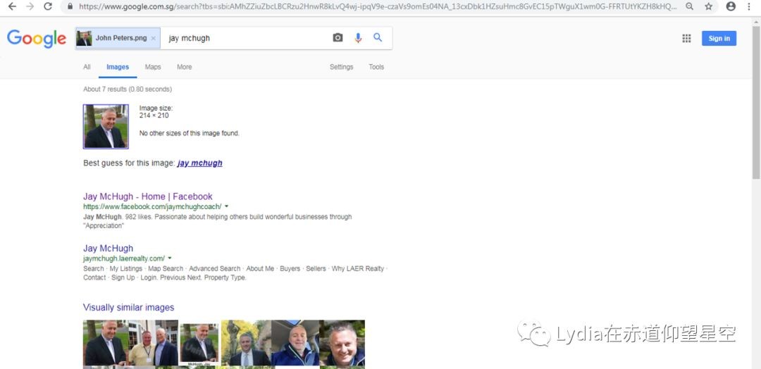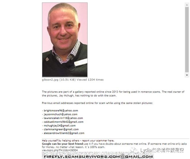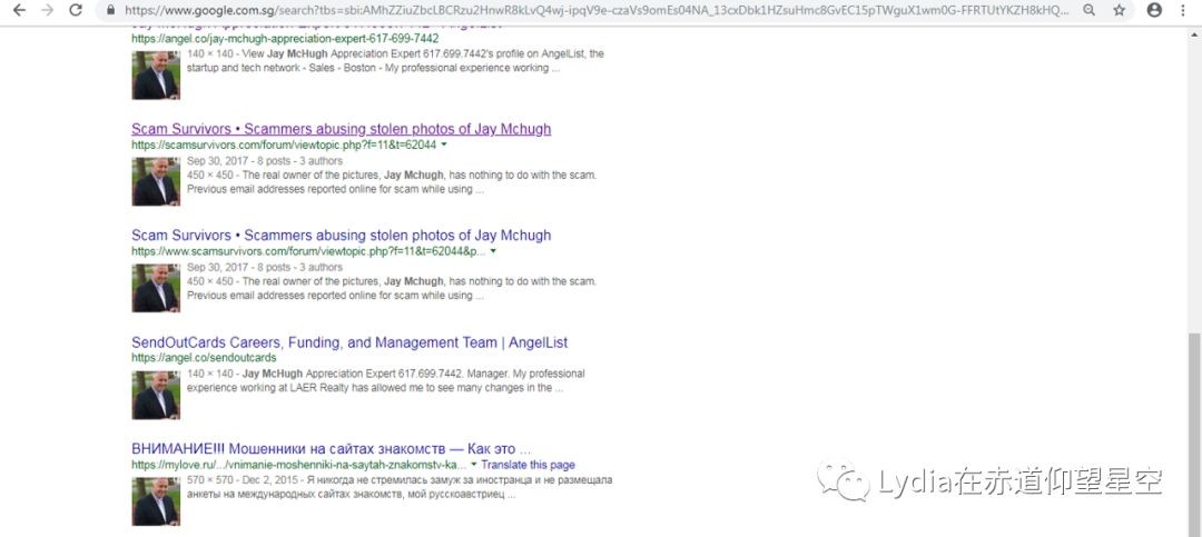 然后我google上载了他的头像图片,搜索图片显示这个头像的真正主人叫Jay Mchugh。 2013年起就有人盗用他的图片进行爱情金钱诈骗,这倒霉孩子,没想到现在还在被盗用。而且被盗的这张还不是他最好看的照片,这么猥琐,真的能骗到人吗?这骗子审美有问题啊!