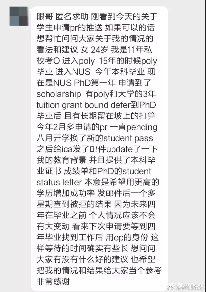 有网友问新加坡眼,她在新加坡待了7年,新加坡国立大学本科毕业后,继续硕博连读,毕业后有继续留在新加坡的打算,但是她最近申请PR却被拒了。