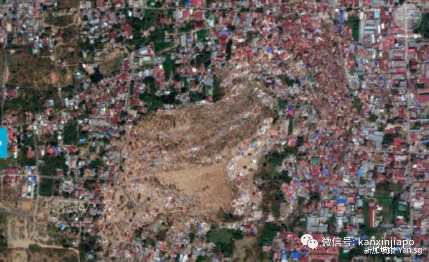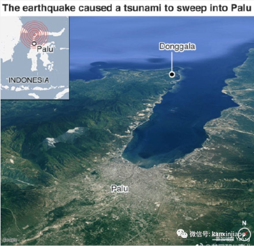 从卫星图像上看,位于海峡尽头的Palu被海水淹没,触目惊心。