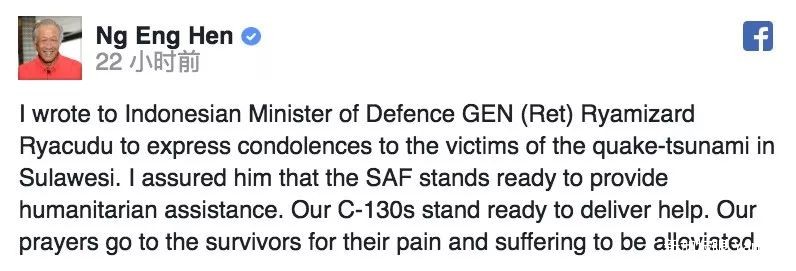 翻译:我写信给印度尼西亚国防部长GEN(Ret)Ryamizard Ryacudu,向苏拉威西岛地震海啸受害者表示哀悼。我向他保证SAF已做好人道主义救援的准备。我们的C-130已做好运输支援的准备。我们祈祷幸存者的痛苦得到缓解。
