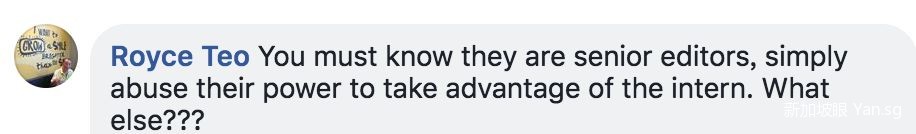 女实习生是新加坡报业控股集团(SPH)奖学金得主,她曾经先后进入这两位高级编辑的部门实习。