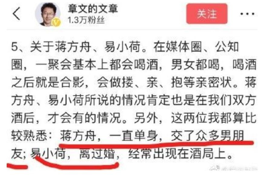 而后在微博发文称“蒋方舟,一直单身,交了很多男朋友;易小荷,离过婚,经常出现在酒局上。”暗指她们生活不检点。