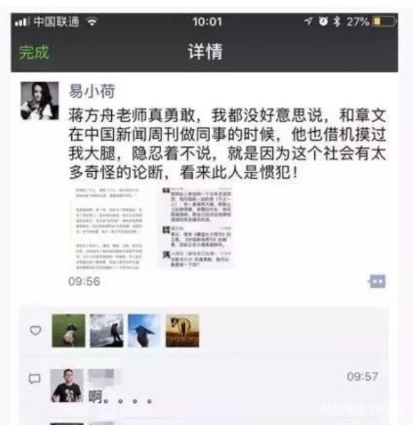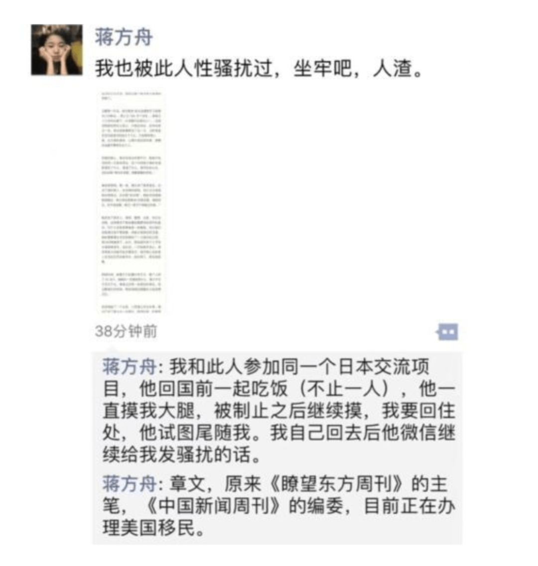随后,作家蒋方舟、媒体人易小荷和艺术家王嫣芸实名爆料,均称曾遭受章文“性骚扰”。