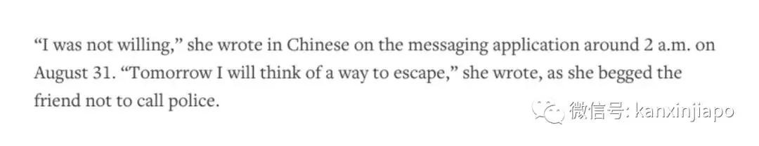 路透社在文中详细叙述了,案发当晚(8月30日至31日凌晨)的一些详情,并曝光了女生在31日凌晨两点的微信对话,她跟朋友发消息说,“我不是愿意的,明天我会想办法逃出来”