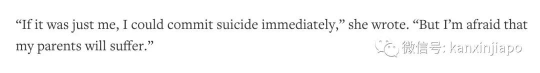 并且继续写道:“如果只是我自己,我甚至想自杀”,但是“我担心自己父母受不了”。