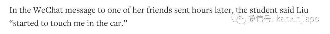 在车上,女生称刘强东对自己进行了骚扰。事发后,她在自己和A同学聊天框里写道“他开始在车上摸我…….那时我乞求他不要,但是他不听”。