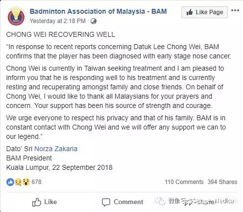 前几天(9月21日),网传羽坛名宿李宗伟患上鼻咽癌,而这一消息随后也得到了其官方脸书账号以及马来西亚羽球协会主席的证实。