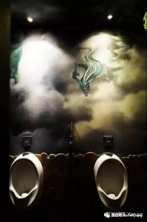 但它作为一个餐厅,最有名的居然是厕所。它的男厕墙壁是由台湾金马奖最佳美术指导、国宝级的喷绘大师李锡坚喷绘的“西方龙”,灵感来自《哈利波特》。