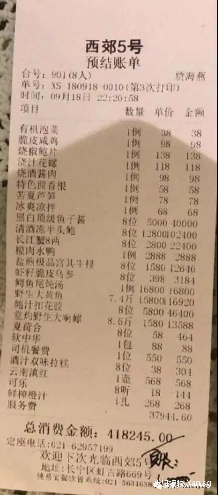 我们先来“瞻仰”一下这个天价收据。蒋鑫吃的这顿饭难不成都是龙肝凤髓做的,不然怎么会这么贵!