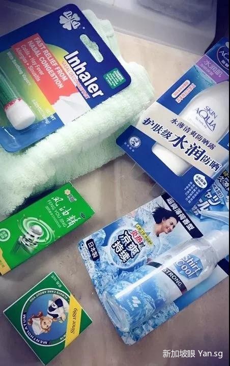原来,这个蓝色小包里面装的是一些在新加坡生活不可缺少的用品,比如降温用品、毛巾、清凉油、防晒霜等等。空姐空少们也是挺细心的呀~