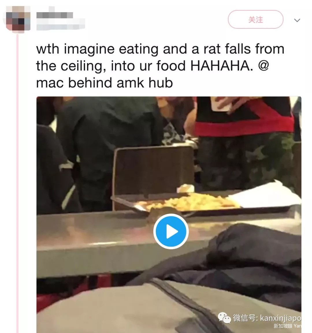 新加坡麦当劳惊现老鼠从天而降,吓得帅哥手足无措
