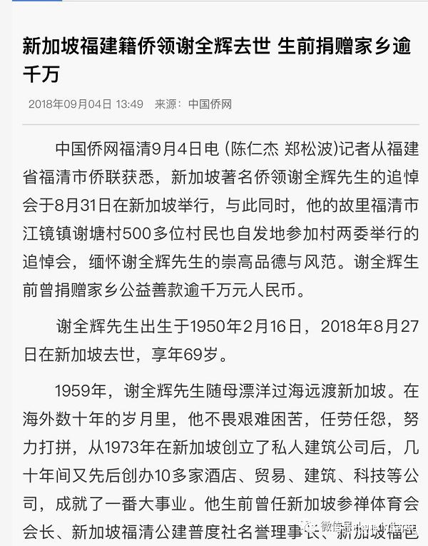 8月31日,在新加坡举行了原福建籍的侨领谢全辉先生的追悼会,而在远在千里之外的福清市江镜镇谢塘村,还有500多位村民自发地组织参加了另一场追悼会。