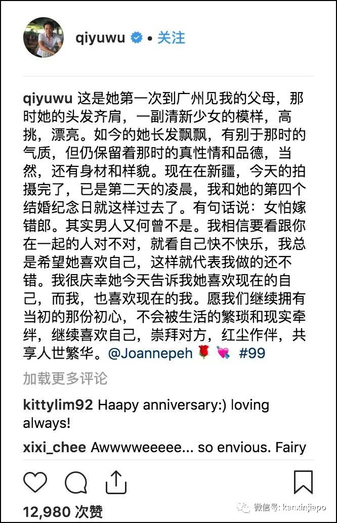 “4年前的今天,我成为了戚太太。虽然我非常清楚,你有意向在中国发展自己的事业,而且我们不能随时见面,但我还是同意了你的求婚。每年的生日、纪念日、节日……你都会回来陪我。我很珍惜我们在一起的时光,每年结婚纪念日,我们都会回到同一家餐厅,但是今年却没有。虽然我们天各一方,但是我觉得我们比以前更加亲密了。谢谢你看到我的好。感谢@qiyuwu。”