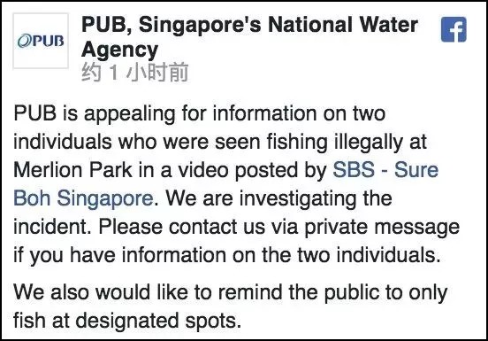 钓鱼的年轻人啊,兴不兴奋?开不开心?然而,悲剧来了~~因为鱼尾狮公园禁止垂钓,新加坡公用事业局在脸书放话,要见见这二位了。