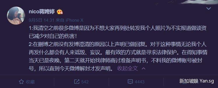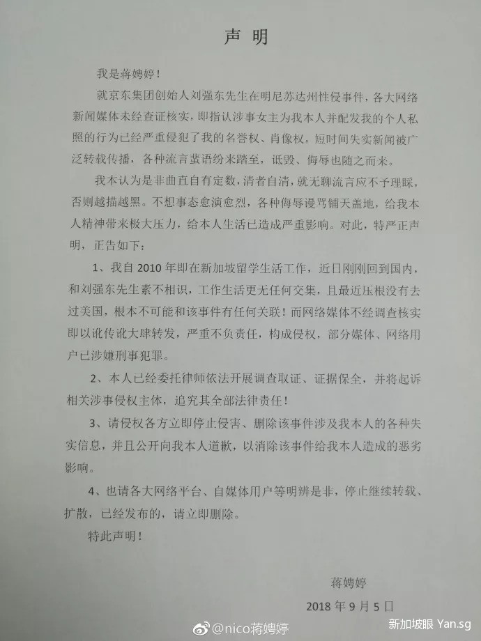 9月5日中午,被卷入刘强东案件的新加坡留学生蒋娉婷,首次在微博上发表声明,澄清自己和此案件一点关系都没有。