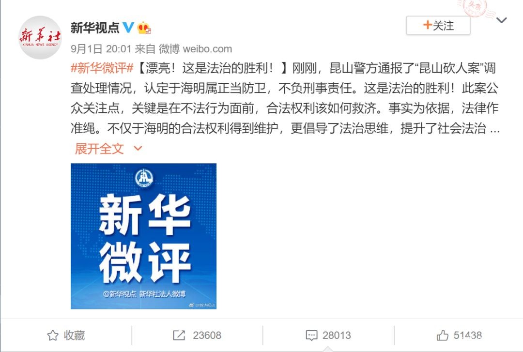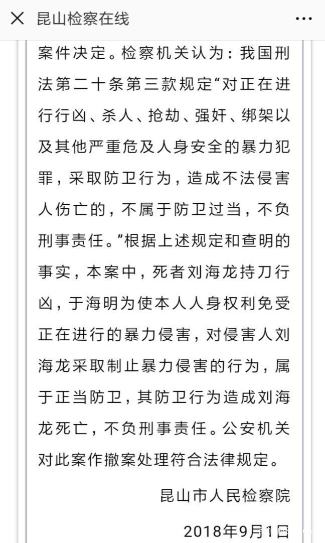 昆山市人民检察院也认为,于海明属于正当防卫,不负刑事责任。