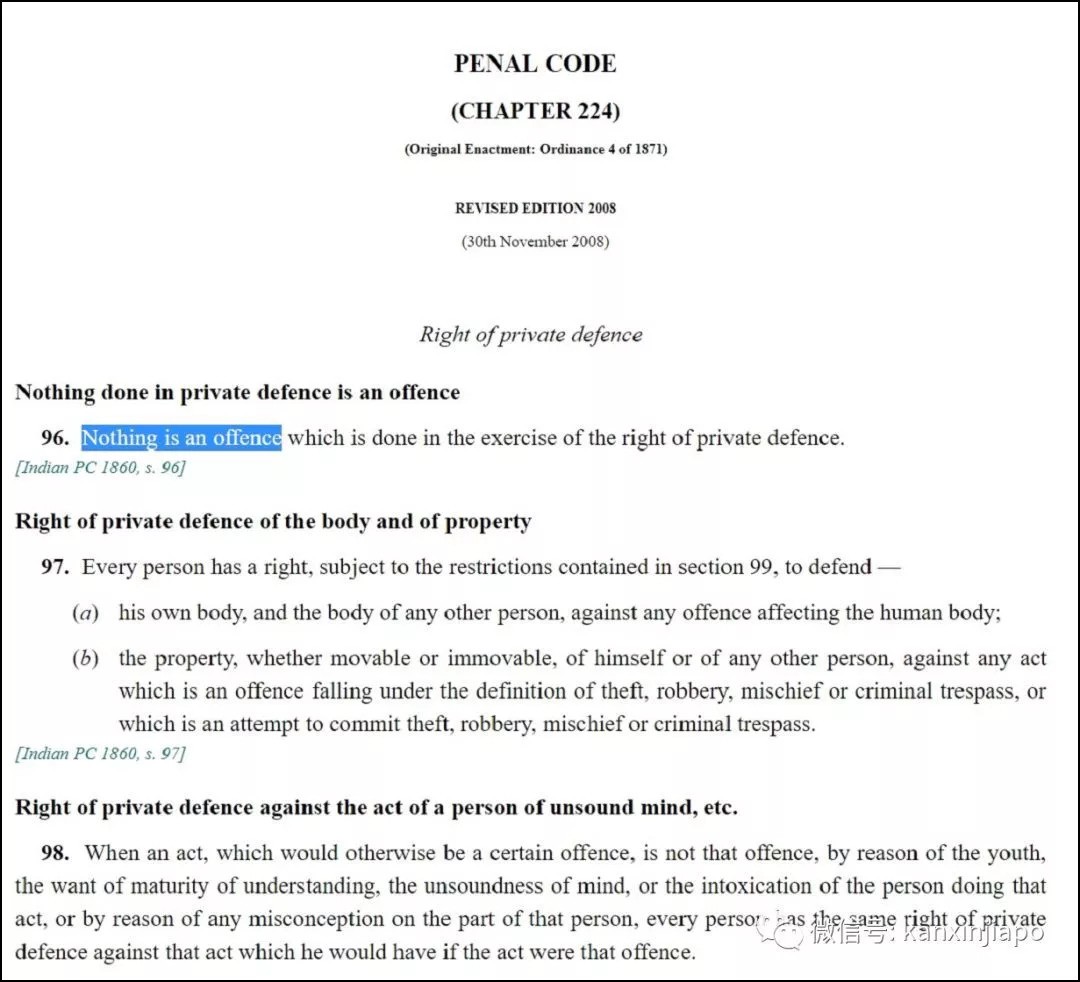 新加坡刑法第96条规定:任何自卫行为都不构成刑事犯罪。