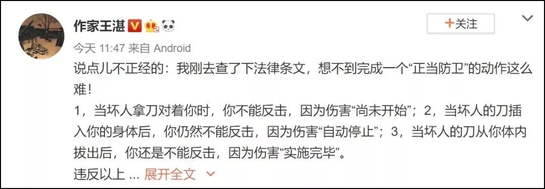 不过,关于此事,讨论最多的还是“正当防卫”“防卫过当”,以及中国的“正当防卫有多难”。