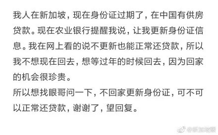 最近,我们收到网友的求助,说自己人还在新加坡但身份证过期了,如果不回中国更新身份证,能不能正常还贷……