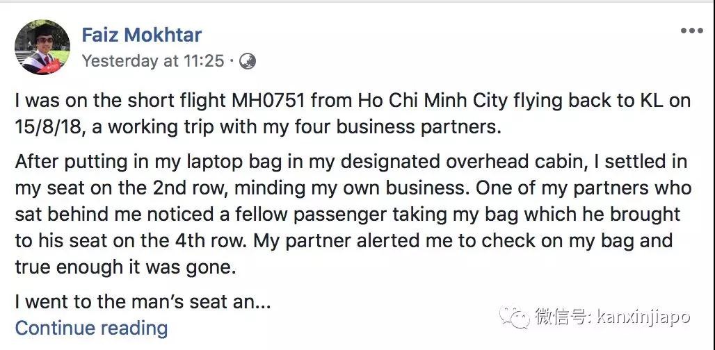 昨天,网友Faiz Mokhtar在Facebook上分享了他在商务舱被盗取个人财务的经历: