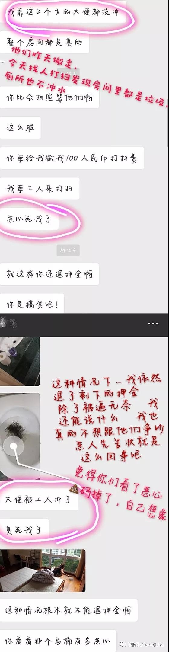 还有图片,其他房客天天投诉,而且用完厨房不清洁导致有很多虫子,退房不打扫房间也不冲,这是正常女生吗???那些支持他们的人,你们愿意跟他们一起住吗?去厨房厨房有虫,去客厅客厅有垃圾,经过房间还可能闻到屎味,你能接受跟他住你再来骂我。哪个房东能接受我免费介绍他们给你当房客。