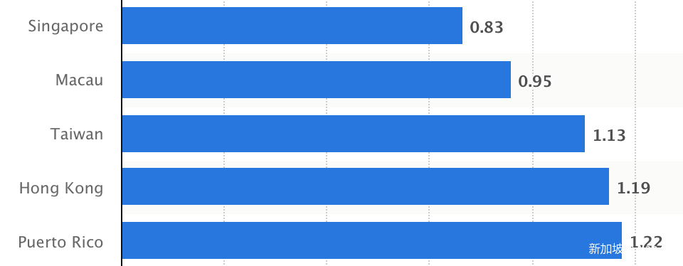 (全球224个国家(或地区)中,生育率最低的前5名依次为:新加坡、澳門、台灣、香港、波多黎各。)