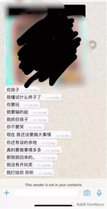 我们当晚去警察局报了案,做了笔录,按照警察的建议,我不再理睬大耳窿的电话和短信,并屏蔽了他们的号码。连续一两周他们每天换着号码给我疯狂打电话、发短信进行骚扰和威胁,并通过WhatsApp下载了我和孩子的照片发给我,威胁要抓我孩子。