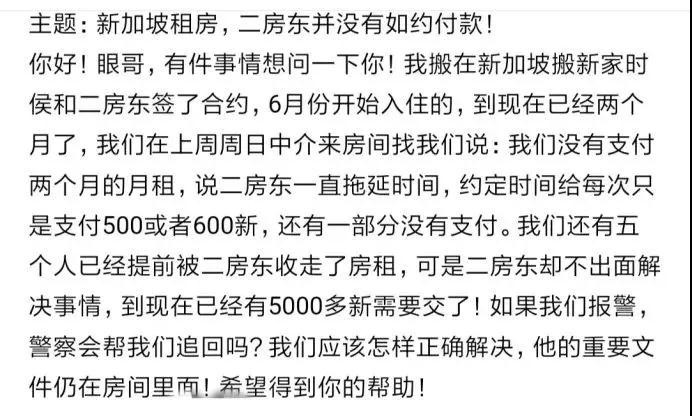有网友问我们,二房东提前收了房租,却没有把钱交给房东,现在欠了5000多新币,能够报警处理吗?