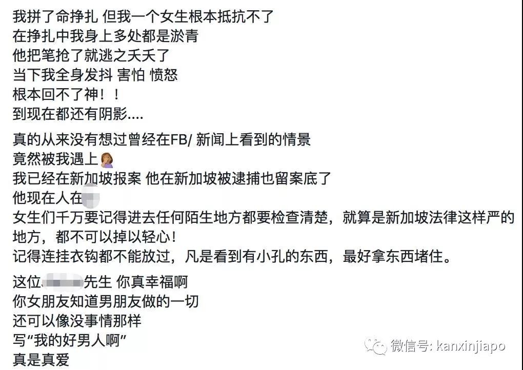 该名网友将此事在网上曝光,就是为了提醒女生们,就算是在新加坡这样治安好、法律严的地方,也会有这样的事情发生。