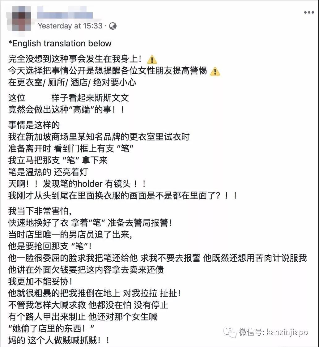 昨天(8月3日),一名来自马来西亚的女生在Facebook上发表贴文,称自己在新加坡某商场试衣服时,发现有微型摄像机,自己竟然被偷窥了!