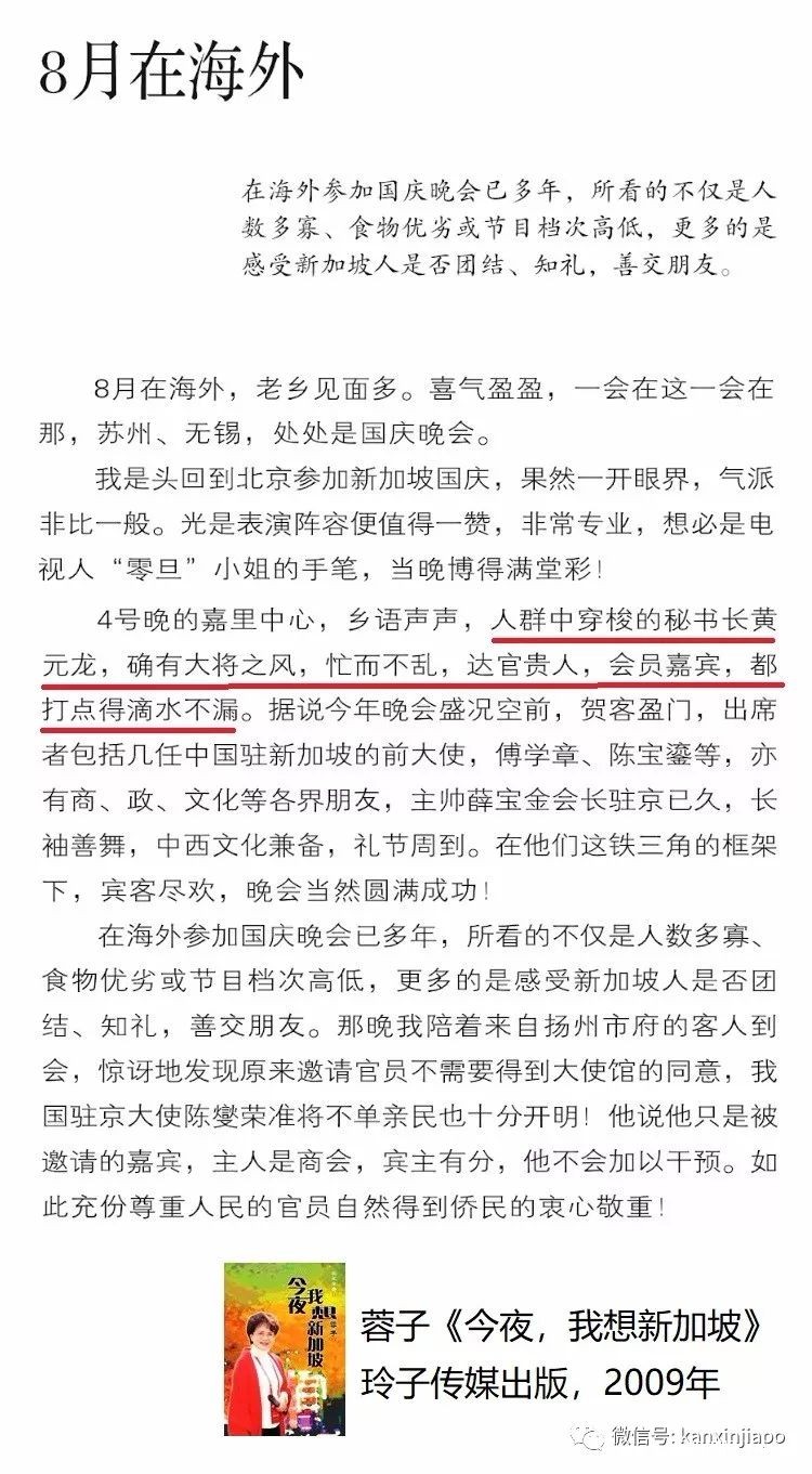 龙哥在SingCham虽“贵为”秘书长,但负责的具体事务不少。其中一个就是每年八月在北京举办的新加坡国庆晚会,如果缺了他的统筹,怕不容易做好。2009年,著名新加坡作家蓉子在《今夜,我想新加坡》就有这么一段文字:
