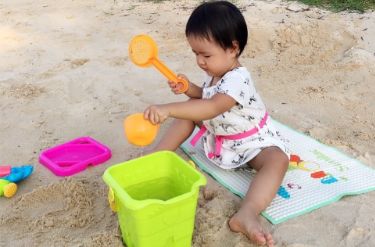 3. 在海边玩沙时把水浇在沙滩上,说是给沙滩洗澡。