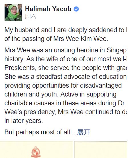 新加坡前总统陈庆炎亲往吊唁,评价“她为新加坡人树立了一个很好的榜样,从她身上我们学到无私地付出,也明白了如何让生命更有意义。”