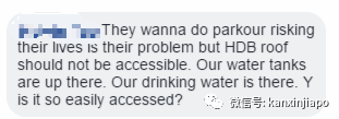 (他们想跑酷,冒生命危险是他们的问题,但是组屋天台不应该是可以进入的。我们的水箱在那里。我们的饮用水就在那里。为什么这么容易就可以上去?)