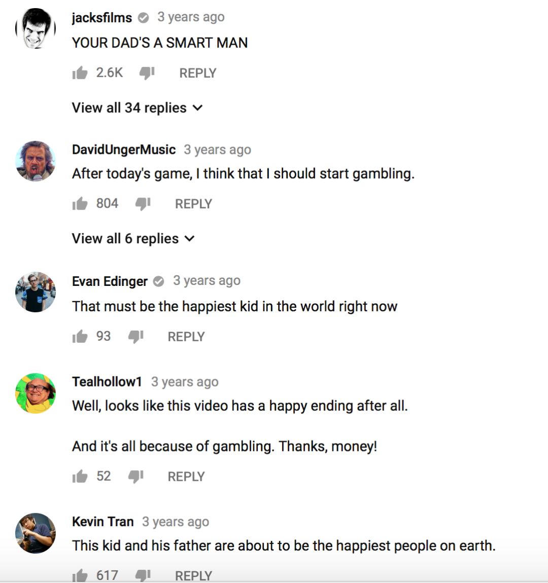 也有网友评论道,“看了这个视频我真的笑不出来。以前我曾经赌博上瘾,所以我知道即使他爸爸赢了他也会输光所有赢来的钱(即使他赢了上百万),然后最后被毒贩子盯上。”