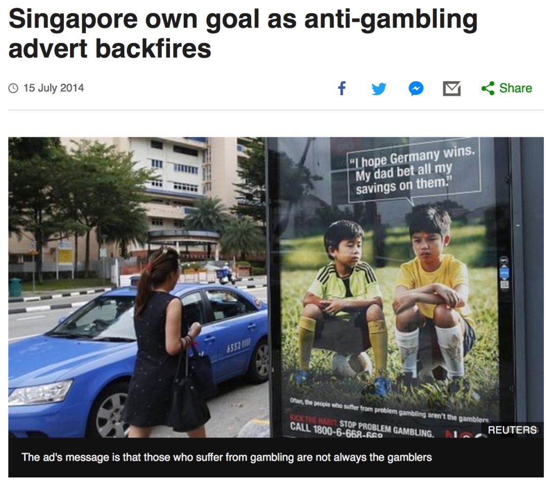 新加坡全国赌博问题协会评论称,巴西世界杯的球迷狂热地预测比赛中的获胜队伍、纷纷把赌注压在自己最喜欢的球队上,基于这一现象他们策划了这一广告。