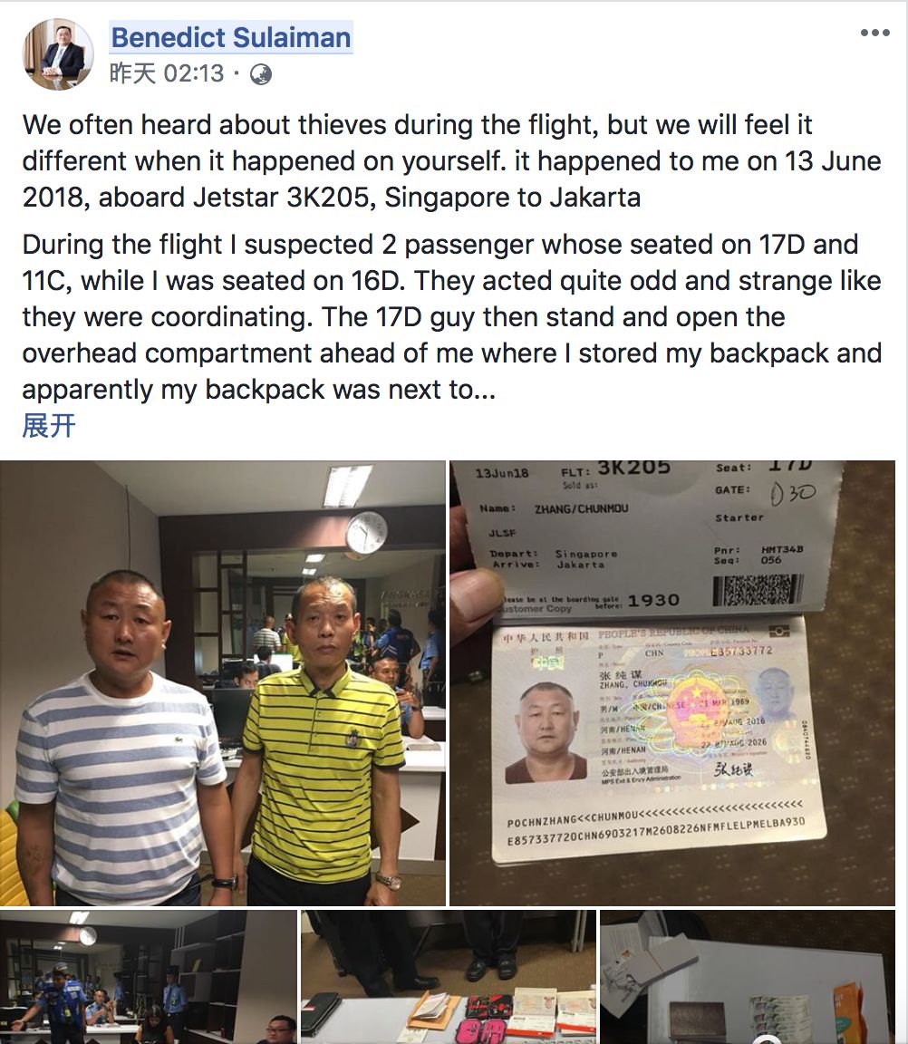 6月13日,一位乘客在搭乘捷星亚洲从新加坡飞往雅加达的3K205航班时,遇到一对小偷。乘客存放在行李架包包内的新元钞票不翼而飞。在乘客的指证下,两名嫌疑人被印尼机场安保人员扣留。