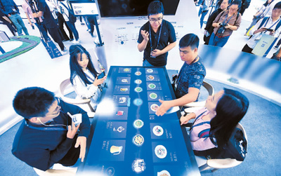图为参观者在2017杭州·云栖大会“未来智能餐厅”的触屏餐桌上体验隔空点餐。