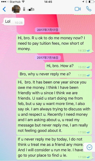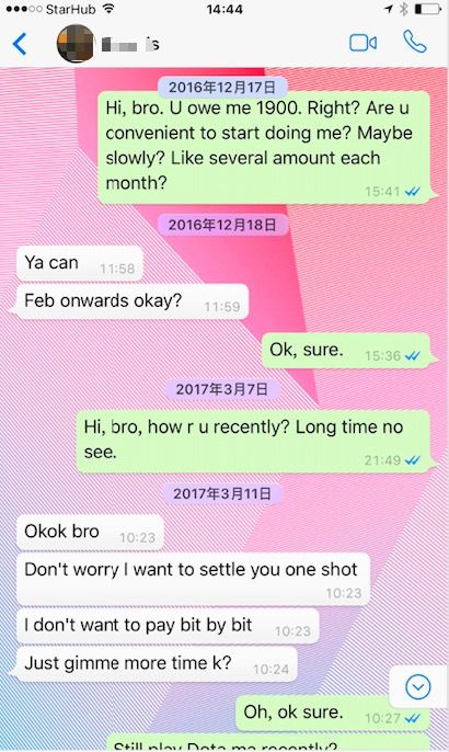 后来他欠了我1900新币,我在2016年12月的时候催他还钱,他说近况不太好,承诺2017年2月开始慢慢还我,然后2017年3月的时候,说是给他点时间,会一次还清我。
