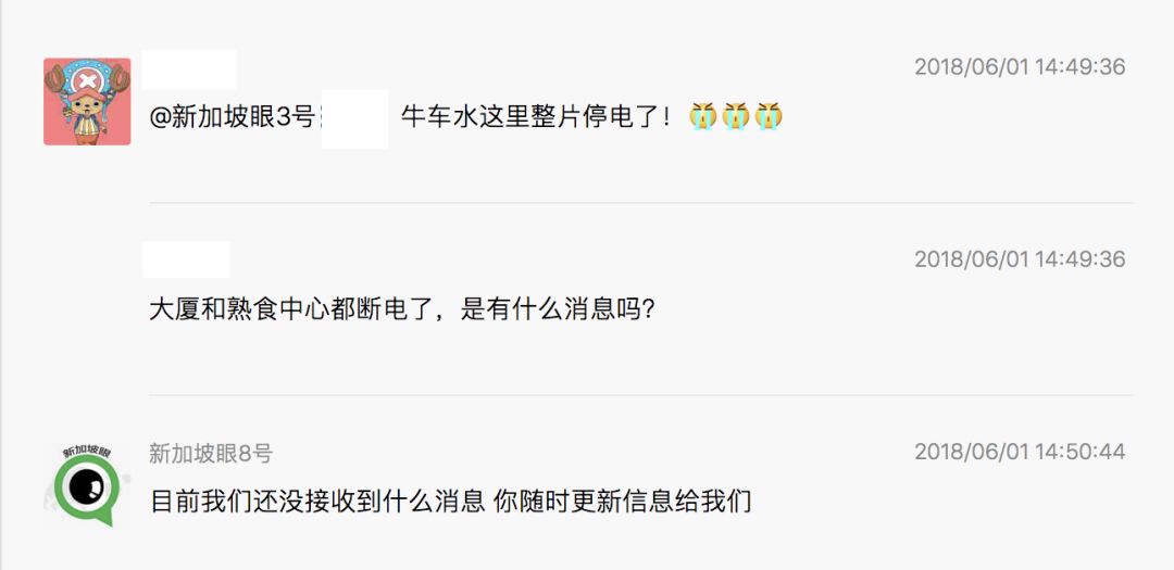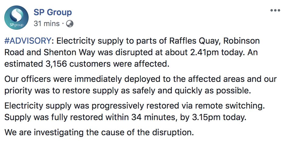 不过,至于大家都关心的断电原因,新加坡能源公司下午四点在facebook上回应,说他们目前还在调查中……