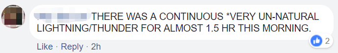 有网友提到今早新加坡空中惊见离奇打雷+闪电,长达一个半小时……