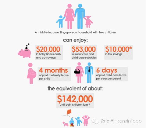 就拿2个孩子(新加坡公民)的中等收入家庭为例,除了最初可得到的2万新币婴儿花红、53000新币的育儿及托儿津贴之外,父母还可获得1万新币所得税减免;此外,每生育一个孩子,妈妈可有4个月带薪产假、父母每年有6天的带薪育儿事假。