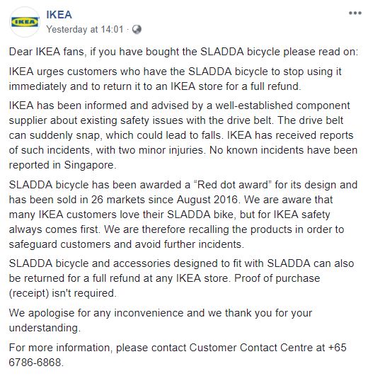 不过,在回应此事时,宜家选择了直面问题,并向所有消费者们道歉。宜家也呼吁购买了SLADDA脚踏车的顾客立刻停止使用,到宜家可得到全额退款,包括所有SLADDA的配件也可以获得退款。