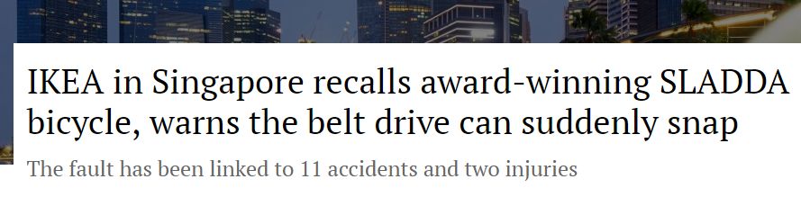 在这11起事故当中,有两人受轻伤。虽然在新加坡还没有人因此受伤,但是基于安全考量,宜家选择召回这款脚踏车。