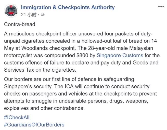 本周一(14日),新加坡移民与关卡局因为一个面包,把一个正要过海关的28岁马来西亚摩托车骑手给扣住了。