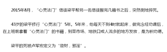 近日,卢军宏已被中国有关部门采取限制入境措施。“心灵法门”也被定性为具有某教特征的非法组织。