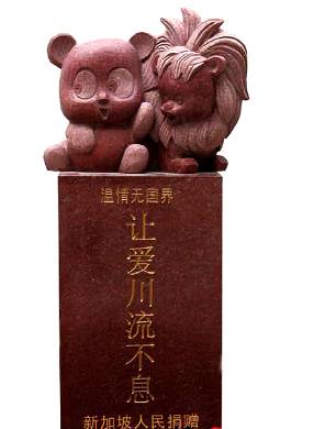 在这些被援建的学校里,都有一座“让爱川流不息”雕像:狮子紧紧依偎在熊猫的身旁。
