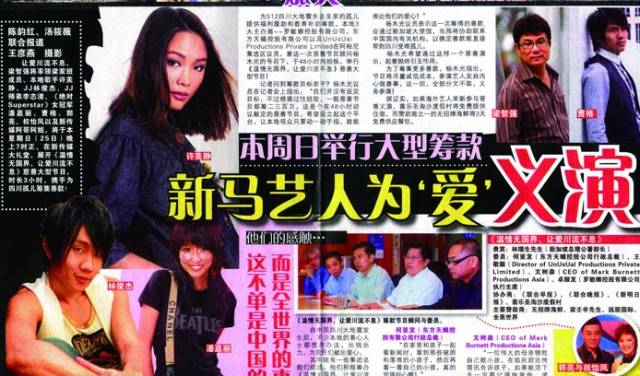 在地震发生之后不久,新加坡就举办了华人在海外的第一场赈灾义演:林俊杰、曹格、权怡凤等新加坡明星纷纷领衔参与。