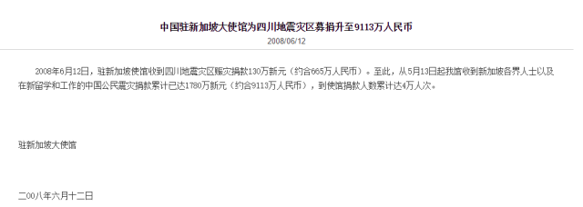 虽然国土不大,但新加坡的捐款金额占了亚洲各国捐款的三分之一。她也是除了中国大陆、香港、台湾之外,唯一一个举行赈灾义演的地区,更是唯一一个外国地区。